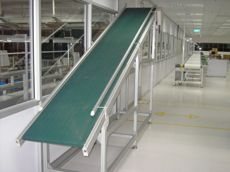 皮帶機(jī)結(jié)構(gòu)形式有:槽型皮帶機(jī)、平型皮帶機(jī)、爬坡皮帶機(jī)、轉(zhuǎn)彎皮帶機(jī)等多種形式,輸送帶上還可增設(shè)提升擋板、裙邊等附件,能滿足各種工藝要求。輸送機(jī)兩側(cè)配以工作臺(tái)、加裝燈架,可作為電子儀表裝配,食品包裝等皮帶機(jī)裝配線。